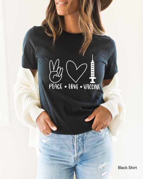 Vaccinated Shirt, Peace Love Vaccine Shirt, Pandemic T shirt, Fully Vaccinated, Womens Pandemic Shirt, Cute Outfit for Him Her, Corona Gifts